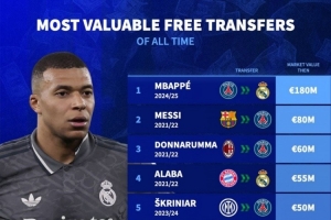 自由转会球员德转身价榜:姆巴佩1.8亿欧居首,梅西8000万欧次席